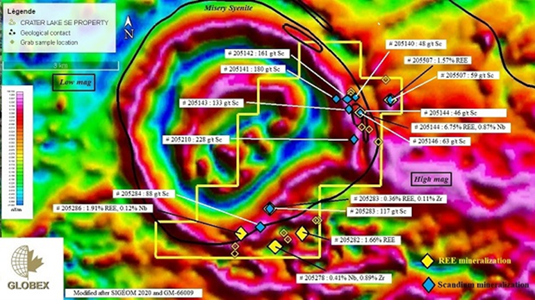 ROUYN-NORANDA, Quebec, Aug. 06, 2024 (GLOBE NEWSWIRE) -- GLOBEX MINING ENTERPRISES INC. (GMX – Toronto Stock Exchange, G1MN – Frankfurt, Stuttgart, Berlin, Munich, Tradegate, Lang & Schwarz, LS Exchange, TTMzero, Düsseldorf and Quotrix Düsseldorf Stock Exchanges and GLBXF – OTCQX International in the US) is pleased to inform shareholders as regards work undertaken by Scandium Canada Ltd. on their adjoining property to Globex’s Crater Lake area property. Scandium Canada reported (click to Scandium press release) that they have completed two separate types of drill programs at their Crater Lake Scandium Project located 200 km ENE of Schefferville, Quebec (13M05).