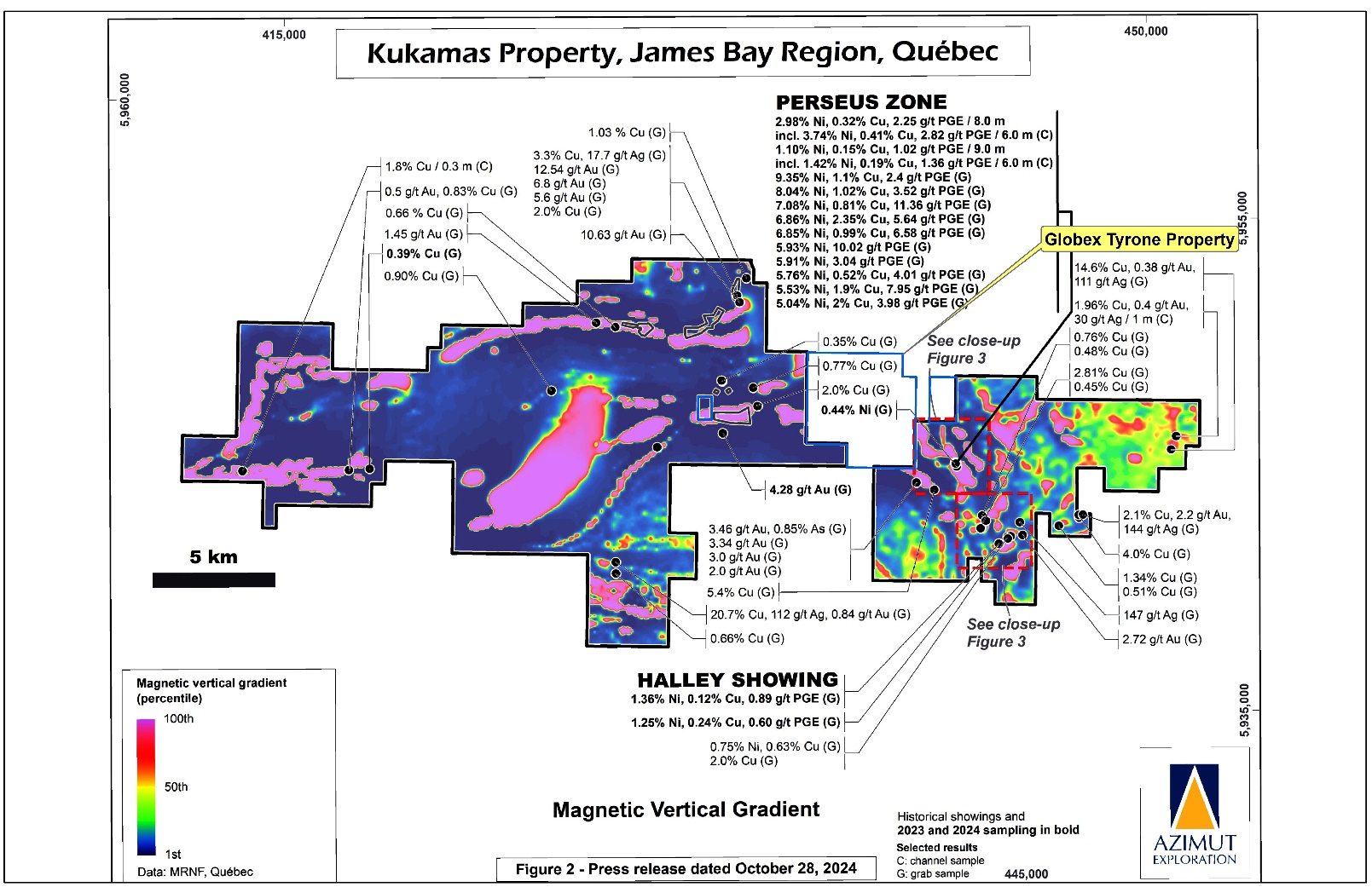 Azimut Exploration has announced 2,000 metre maiden drill program on the Perseus nickel discovery on their Kukamas property in the James Bay area of Quebec. The Kukamas property directly adjoins and is on strike to Globex’s Tyrone project (see Azimut’s press release).