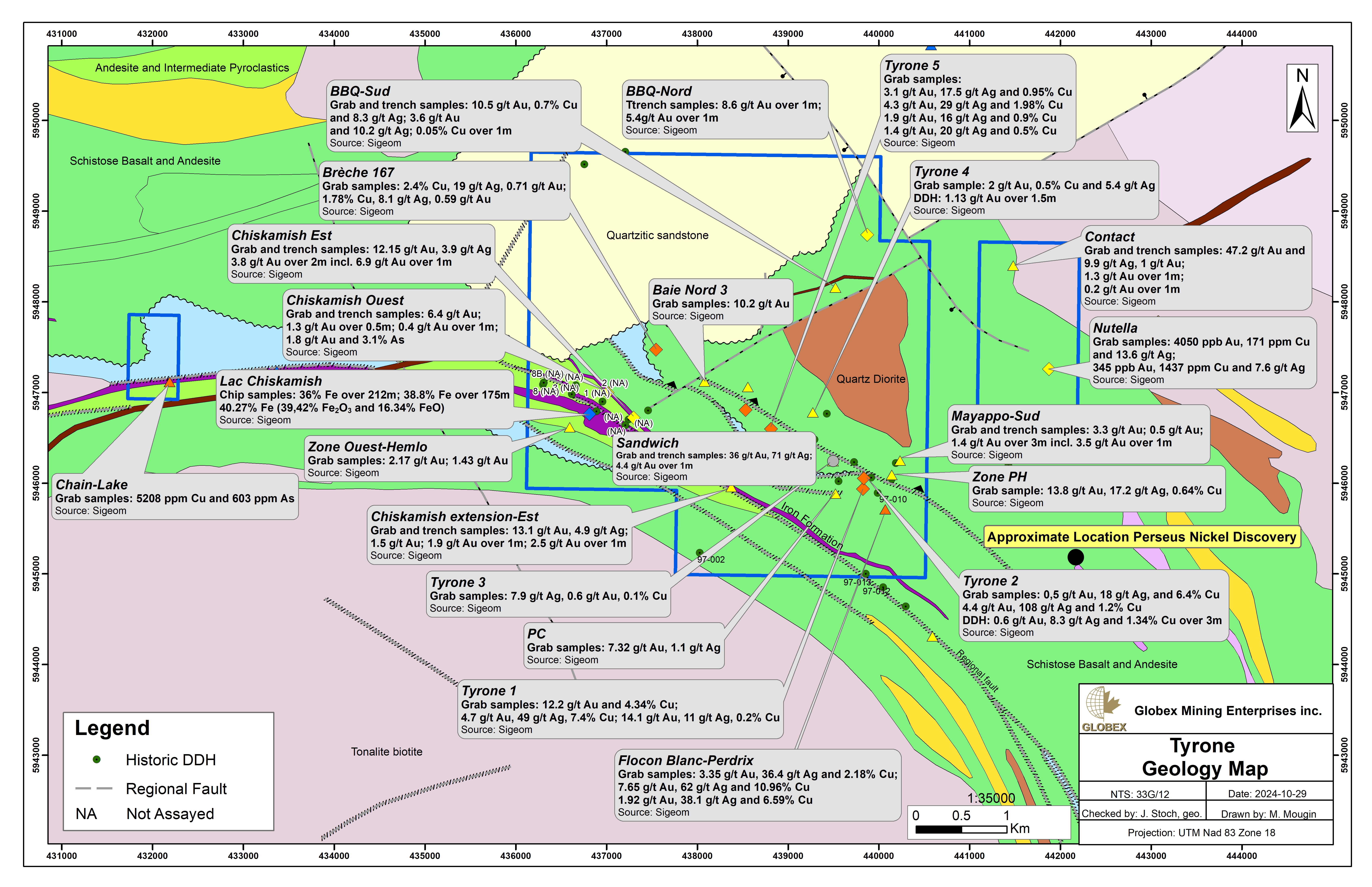 Globex’s Tyrone property has numerous gold and base-metal occurrences in multiple horizons. See map below showing mineralization on Globex’s property and the location of Azimut’s nearby nickel discovery. Globex has completed an aeromagnetic and VTEM survey over the property and an initial property visit.