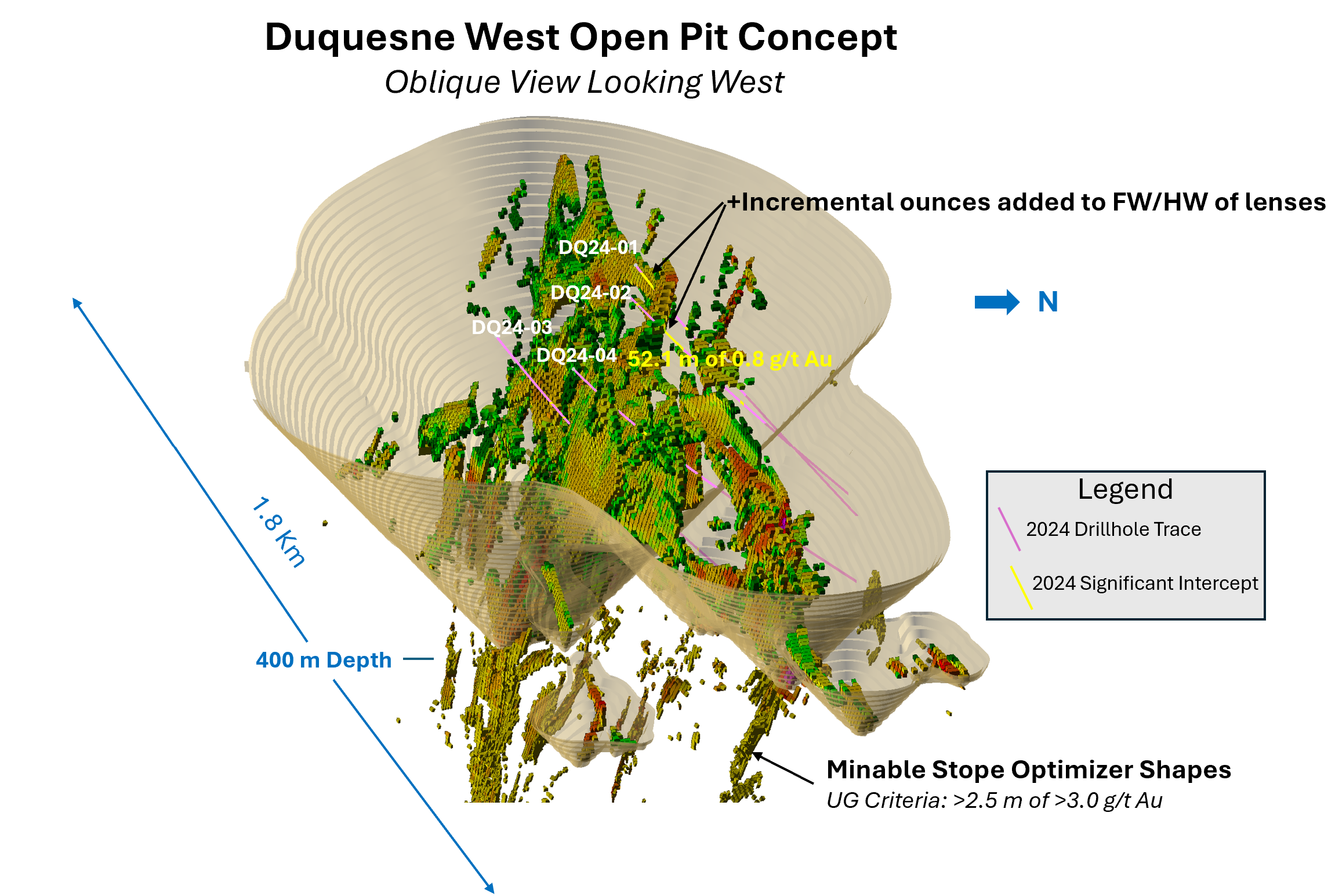 ROUYN-NORANDA, Quebec, Oct. 29, 2024 (GLOBE NEWSWIRE) -- GLOBEX MINING ENTERPRISES INC. (GMX – Toronto Stock Exchange, G1MN – Frankfurt, Stuttgart, Berlin, Munich, Tradegate, Lang & Schwarz, LS Exchange, TTMzero, Düsseldorf and Quotrix Düsseldorf Stock Exchanges and GLBXF – OTCQX International in the US) is pleased to inform shareholders that Emperor Metals Inc. has announced the assay results from the first three drill holes (Holes DQ 24-01 to DQ 24-03, 1,452 metres) of their 19 hole drill program (8,166 metres) at the Duquesne West property located in Duparquet Township, Quebec, under option from Globex (see Globex press release dated October 12, 2022). The Duquesne West Property has a historical mineral resource estimated at 727,000 oz. Au at a grade of 5.42 g/t Au (or 853,000 oz. Au grading 6.36 g/t Au uncut), (source: “Technical Report and Mineral Resource Estimate Update for the Duquesne West/Ottoman property, Quebec, Canada, for Xmet Inc., prepared by David Power-Fardy, M.Sc., P. Geo., Senior Geologist and Kurt Breede, P.Eng., Senior Resource Engineer of Watts, Griffis and McOuat dated October 20, 2011” available here).