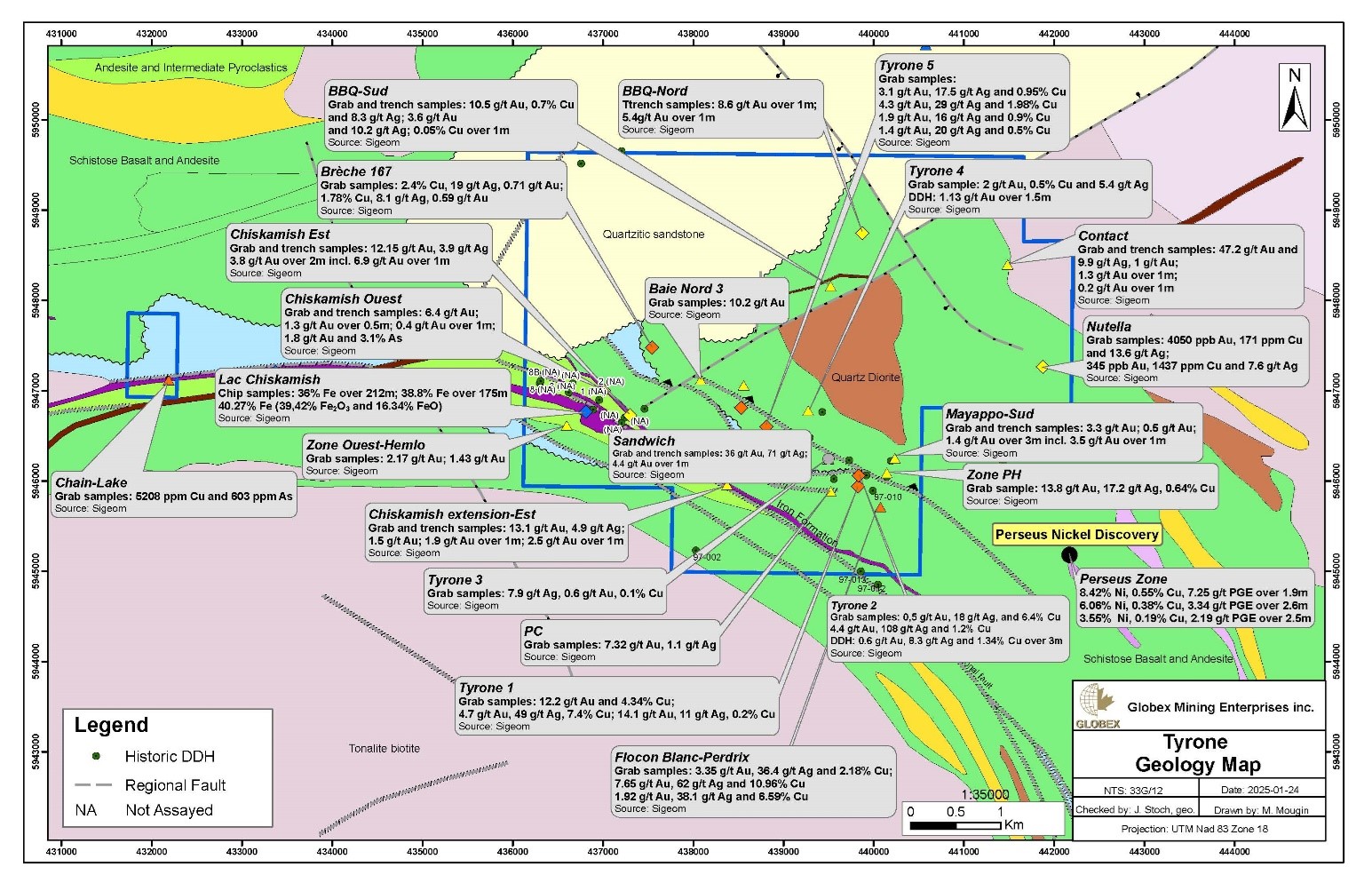 ROUYN-NORANDA, Quebec, Jan. 29, 2025 (GLOBE NEWSWIRE) -- GLOBEX MINING ENTERPRISES INC. (GMX – Toronto Stock Exchange, G1MN – Frankfurt, Stuttgart, Berlin, Munich, Tradegate, Lang & Schwarz, LS Exchange, TTMzero, Düsseldorf and Quotrix Düsseldorf Stock Exchanges and GLBXF – OTCQX International in the US) is pleased to provide a brief update regarding our Tyrone property and Kewagama Gold Royalty.