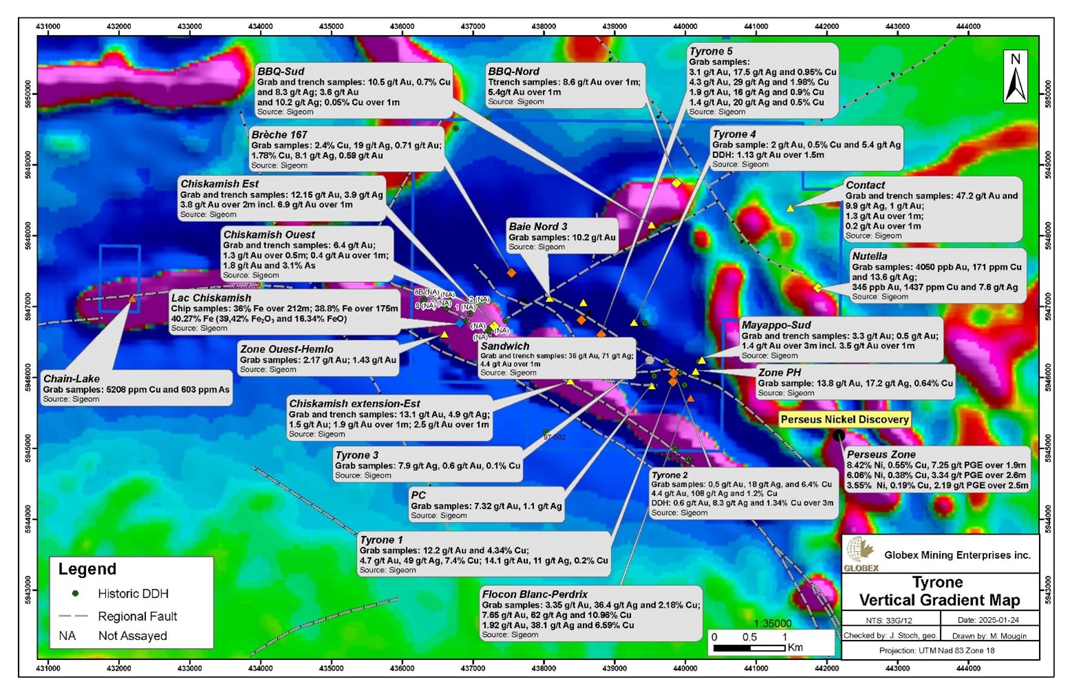 This discovery is located near the southeast boundary of Globex’s Tyrone property. Previous mapping and geophysics suggest that the mineralized rock formations trend onto Globex’s Tyrone claims. The Tyrone property has numerous showings and drill intersections of precious and base-metals as shown on the maps below.