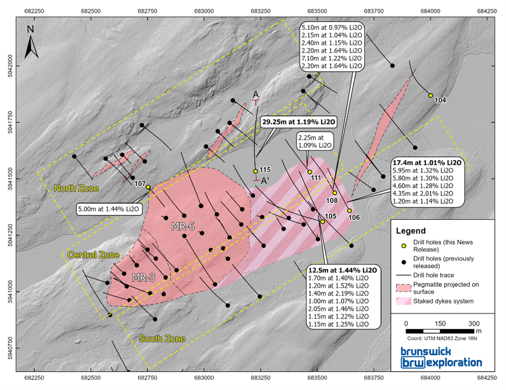 - A newly discovered dyke located approximately 250 metres northeast of MR-6 (a previously discovered lithium area) with hole MR-25-115 intersecting 29.5 metres grading 1.19% Li2O which is open in all directions and;