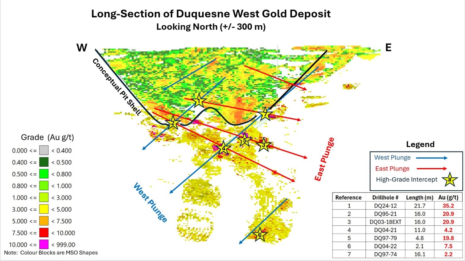 Long-Section view of Duquesne West looking North and showing the two gold trends. A high-grade westerly trend and a main easterly trending gold trend. – Emperor Metals