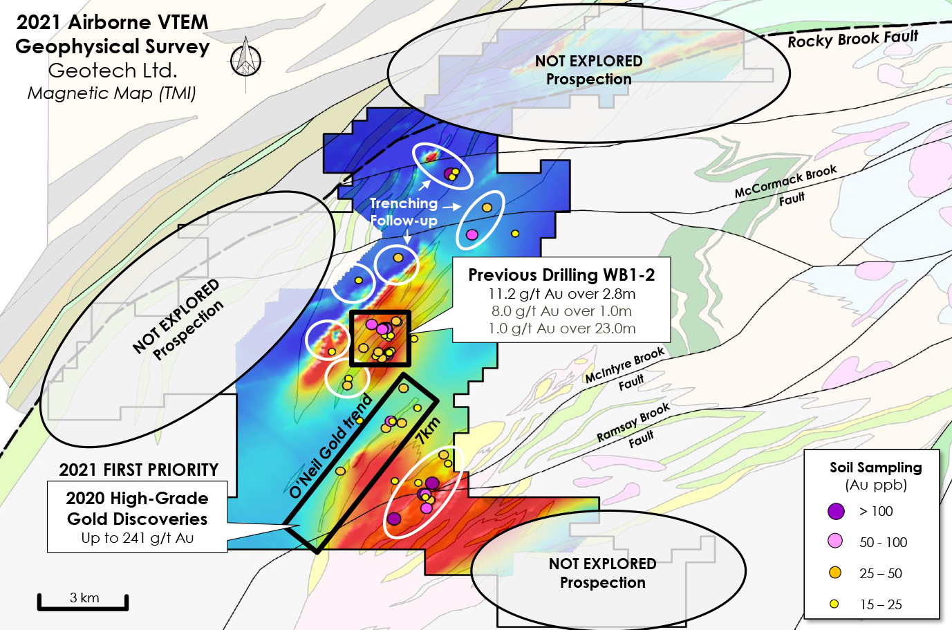 The 2021 summer field exploration program is targeting the Williams Brook Gold property (see Figure 4) with the focus on the recent major discovery named O’Neil Gold Trend (OGT) followed by trenching over 700m with bonanza grades up to 241.0 g/t Au (see news released 2021-03-31).