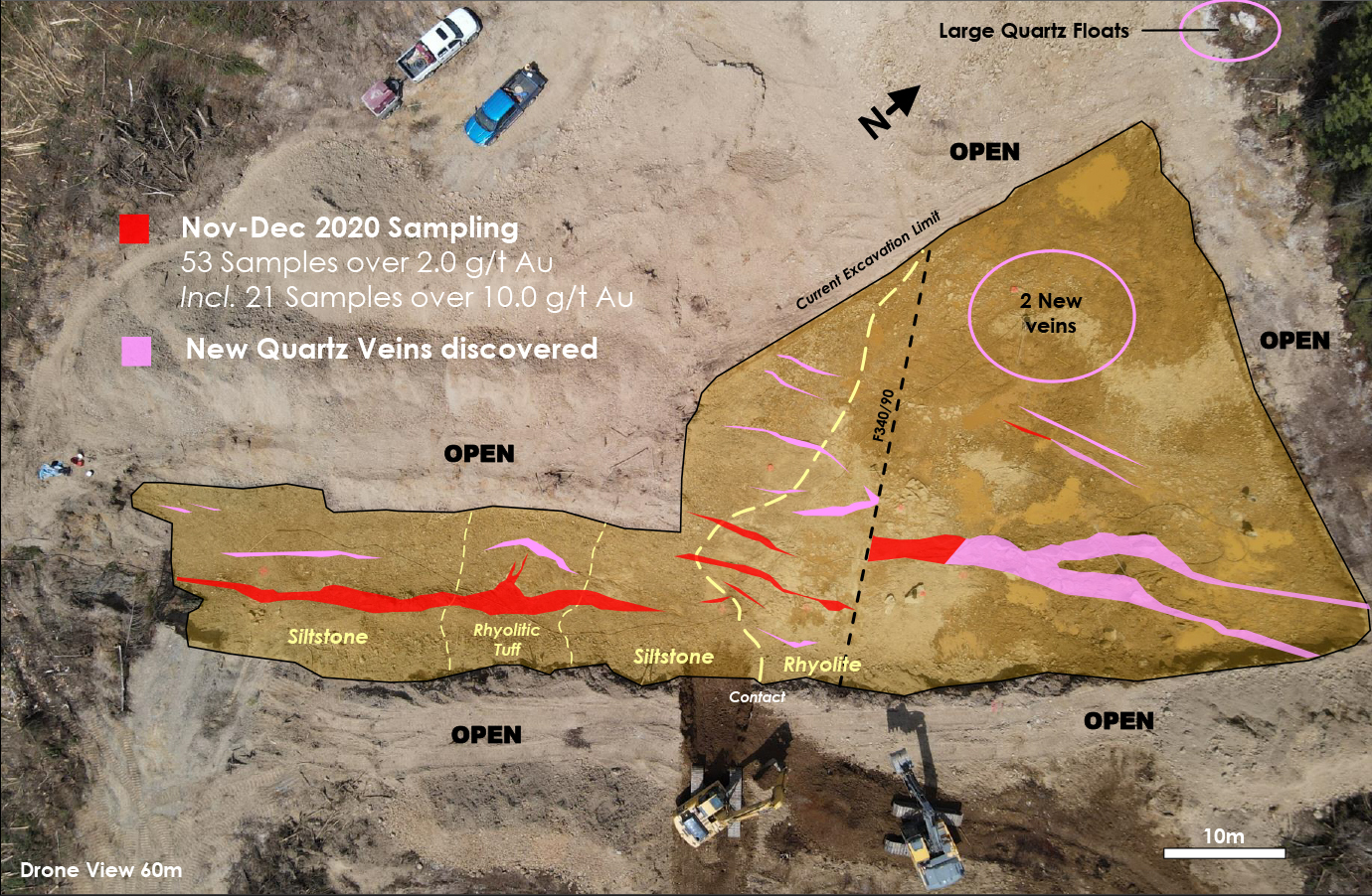 Numerous quartz veins, quartz veinlets, stockworks and breccias were observed mostly perpendicular to the major trend and contain the gold mineralization. The OGT has never been drilled and many gold zones were discovered during the summer 2020 exploration campaign.