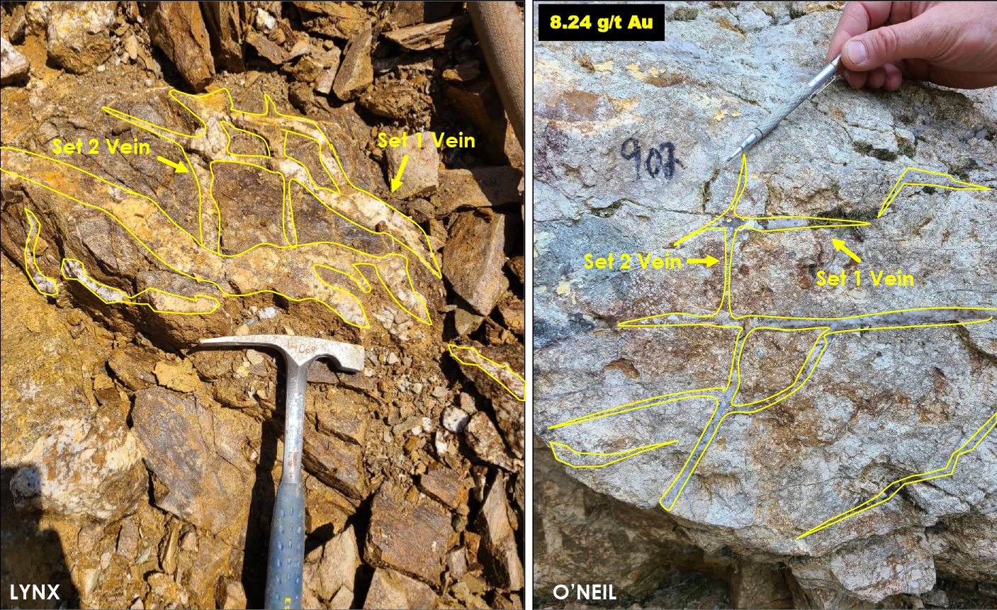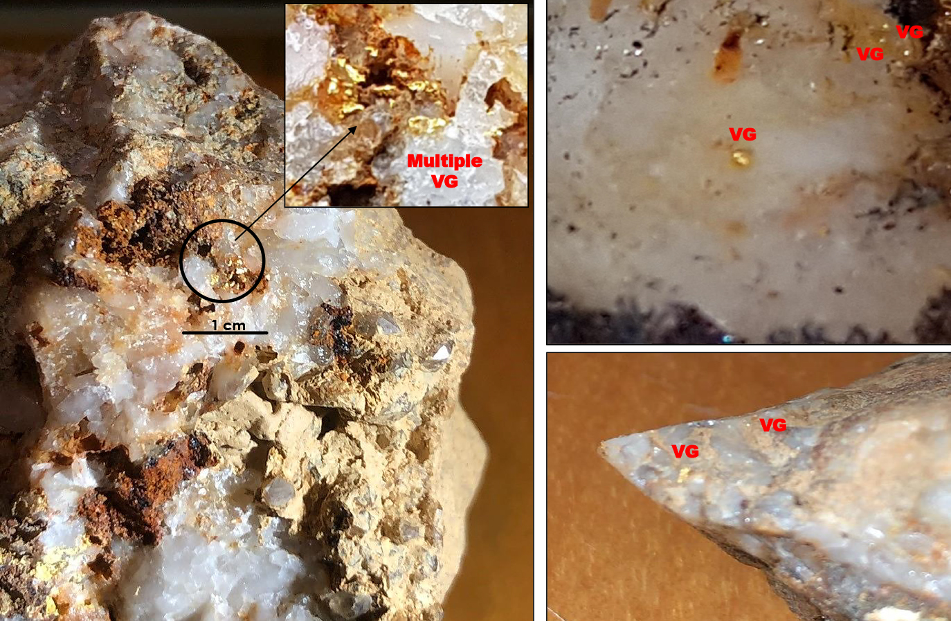 O’Neil Gold Zone (VG**): | 128.5 g/t Au, 44.4 g/t Au, 38.8 g/t Au, 32.8 g/t Au, 23.1 g/t Au |