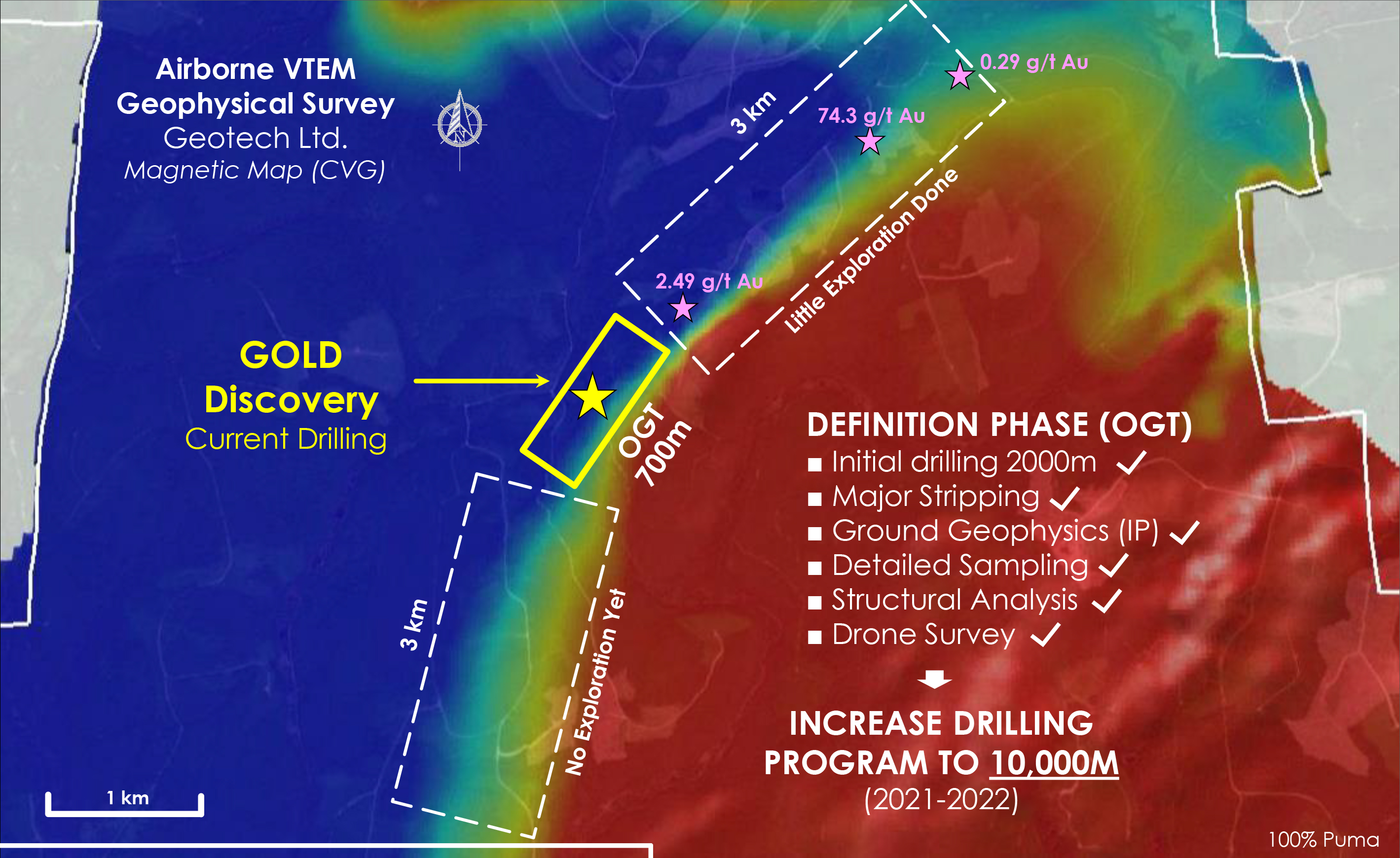 “It is really exceptional to make such a great gold discovery in such a short period of time and with a limited exploration budget. This is the result of the dedicated hard work of all the professionals working with Puma,” commented Réjean Gosselin, Executive Chairman of the company.