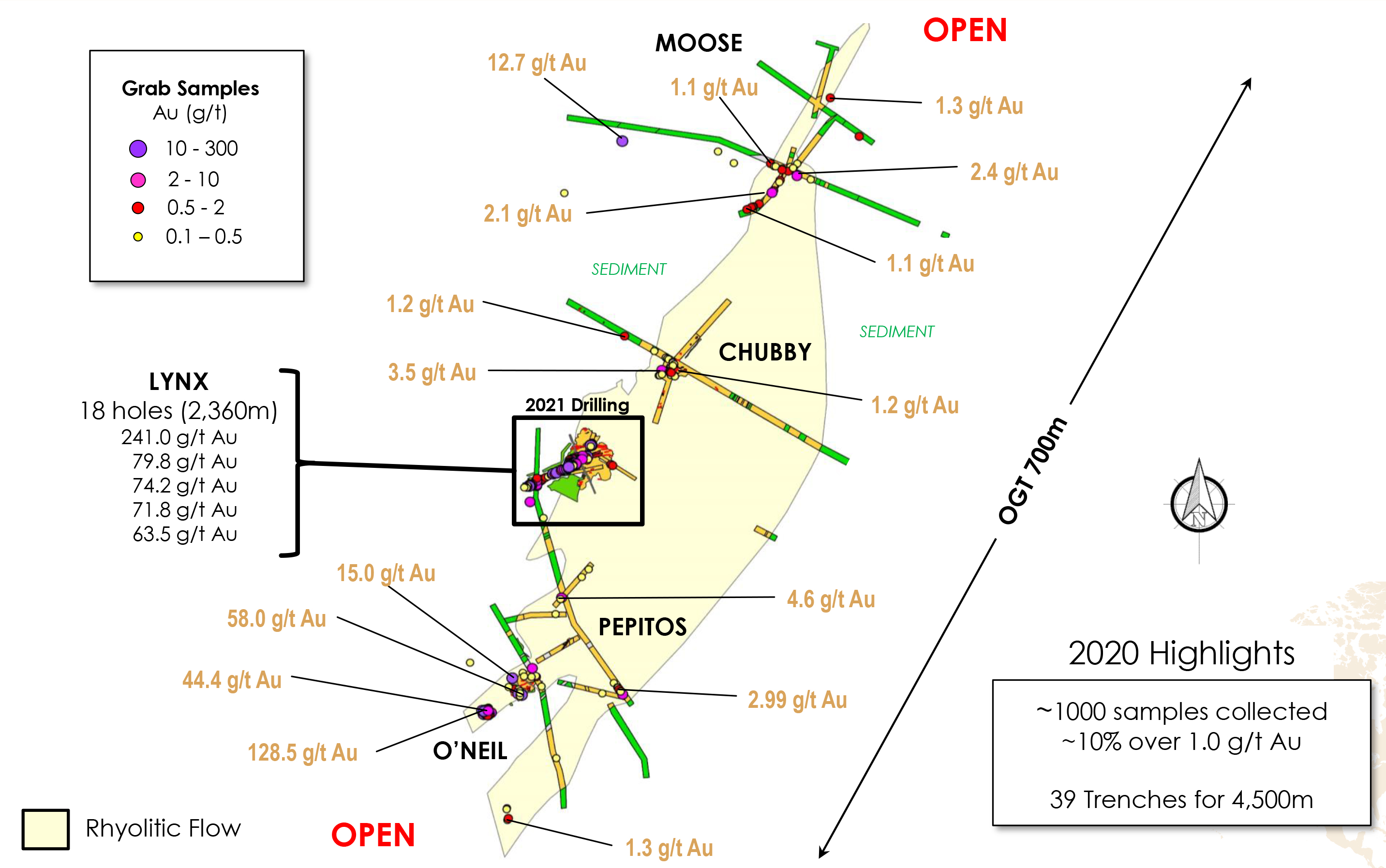 The holes were oriented to intersect the down-dip projection of significant high-grade gold vein networks exposed at surface in trenches and in stripped areas at the Lynx Gold Zone along the O’Neil Gold Trend (OGT).