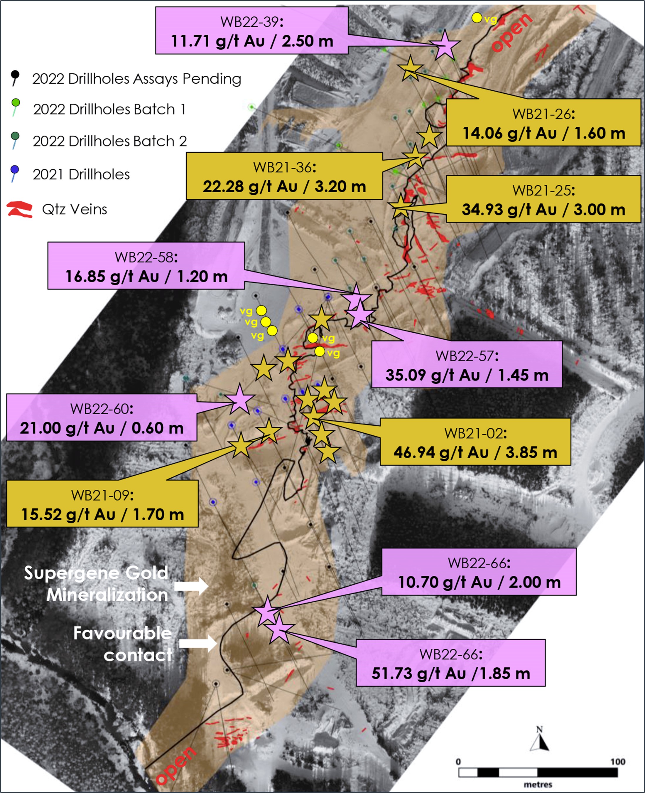 ■ WB22-66: 51.73 g/t Au over 1.85 m (13.49 g/t Au over 7.15 m)