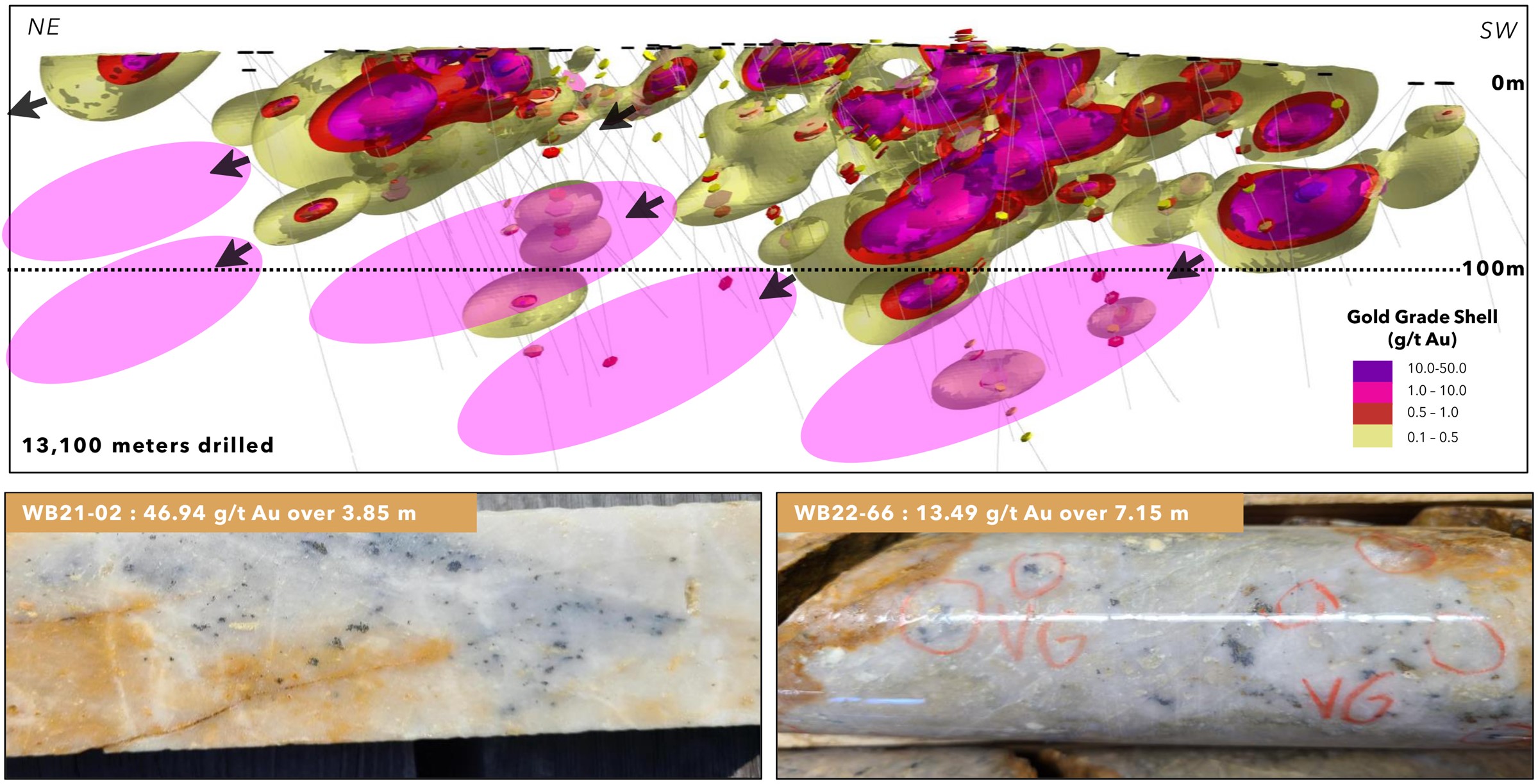 ■ Test the interpreted high-grade gold shoots in the core of the Lynx Gold zone and extend them beyond 100 m depth;