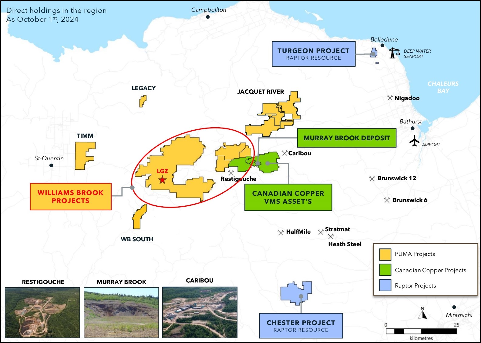 RIMOUSKI, Québec, Oct. 24, 2024 (GLOBE NEWSWIRE) -- Puma Exploration Inc. (TSXV: PUMA, OTCQB: PUMXF) (the “Company” or “Puma”) is pleased to announce the execution on October 23, 2024 of a definitive option agreement (the “Option Agreement’) with KG Exploration (Canada) Inc., a wholly-owned subsidiary of Kinross Gold Corporation (TSX: K, NYSE: KGC) (“Kinross”) with respect to the Williams Brook, Portage and Jonpol properties (collectively, the “Williams Brook Project”) located in Northern New Brunswick, Canada (see Figure 1).