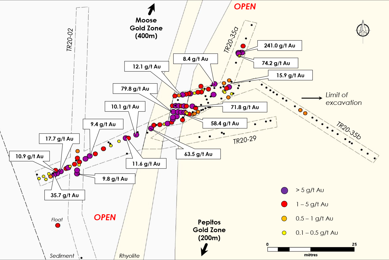 The Lynx Gold Zone (Figure 3) is located 200 meters northeast of the O’Neil Gold and the Pepitos Gold Zone where high-grade gold samples were collected and assayed during the 2020 exploration and trenching program (see news released 2021-02-18, 2020-09-01). Bedrock samples grading up to 240 g/t Au at Lynx have been observed in brecciated quartz veins at the contact between the sediments and the altered rhyolite (see table 1 for gold assays). The contact sediment/rhyolite is hosting the majority of high-grade gold samples collected, so far, along the O’Neil Gold Trend (OGT). Also, Silver-Antimony and bismuth mineralzation were encountered in the trenching which adding to the geological model and will be used as high-grade gold pathfinders.
