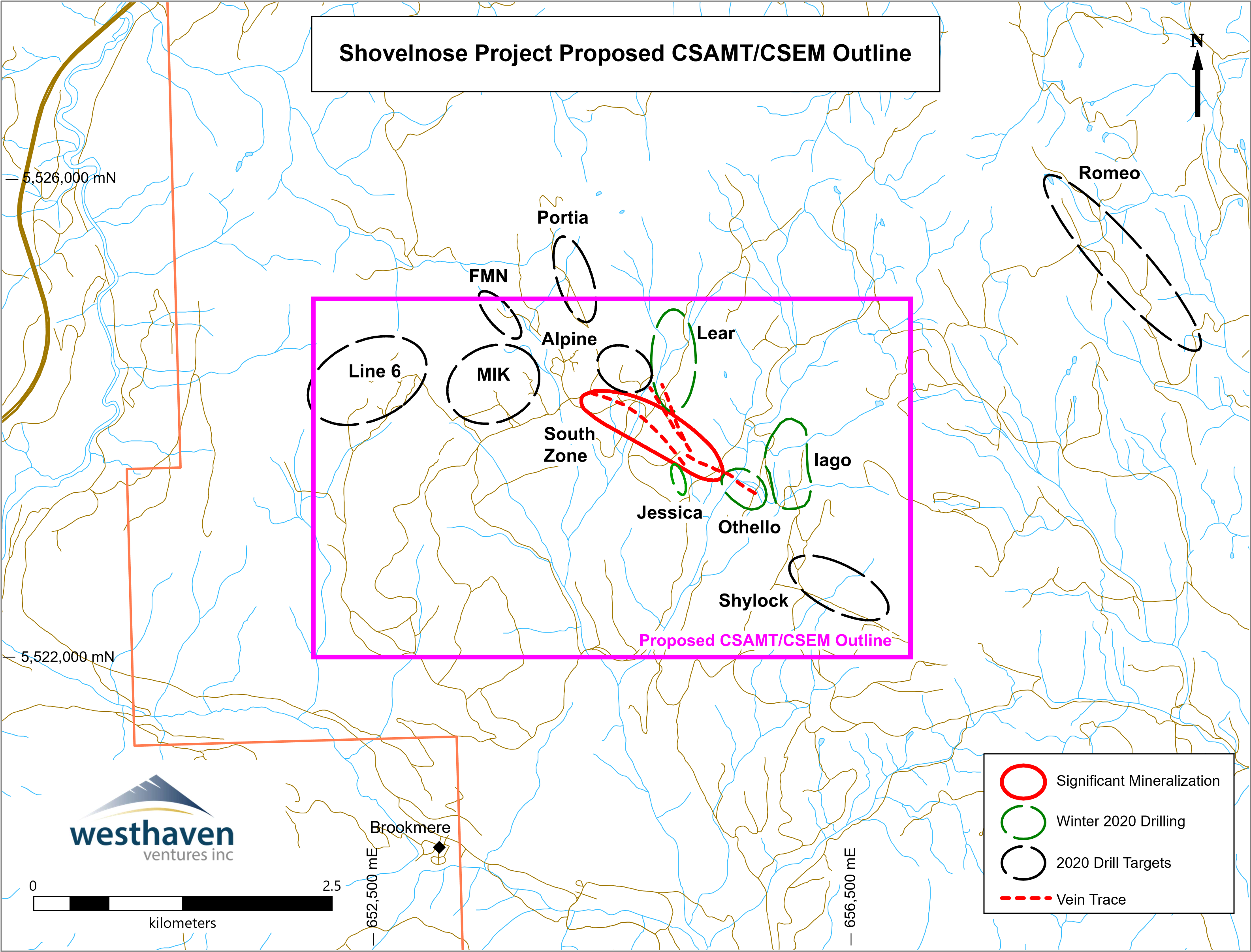 Gareth Thomas, President and CEO of Westhaven, stated: “We have outlined many new drill targets over the past year through prospecting, mapping, ground geophysics and soil geochemistry. We are now refining the higher priority targets, generating new targets and CSAMT will aid in the process. Geophysics continues to play a significant role in successfully targeting high-grade gold veins at Shovelnose. The recently discovered Lear Zone (SN20-56 zone 3 returned 10.56m of 3.67 g/t Au) drill targeting was largely driven by geophysics. The Lear Zone presented as a resistivity high coincident with a magnetic low anomaly, as does the South Zone.”