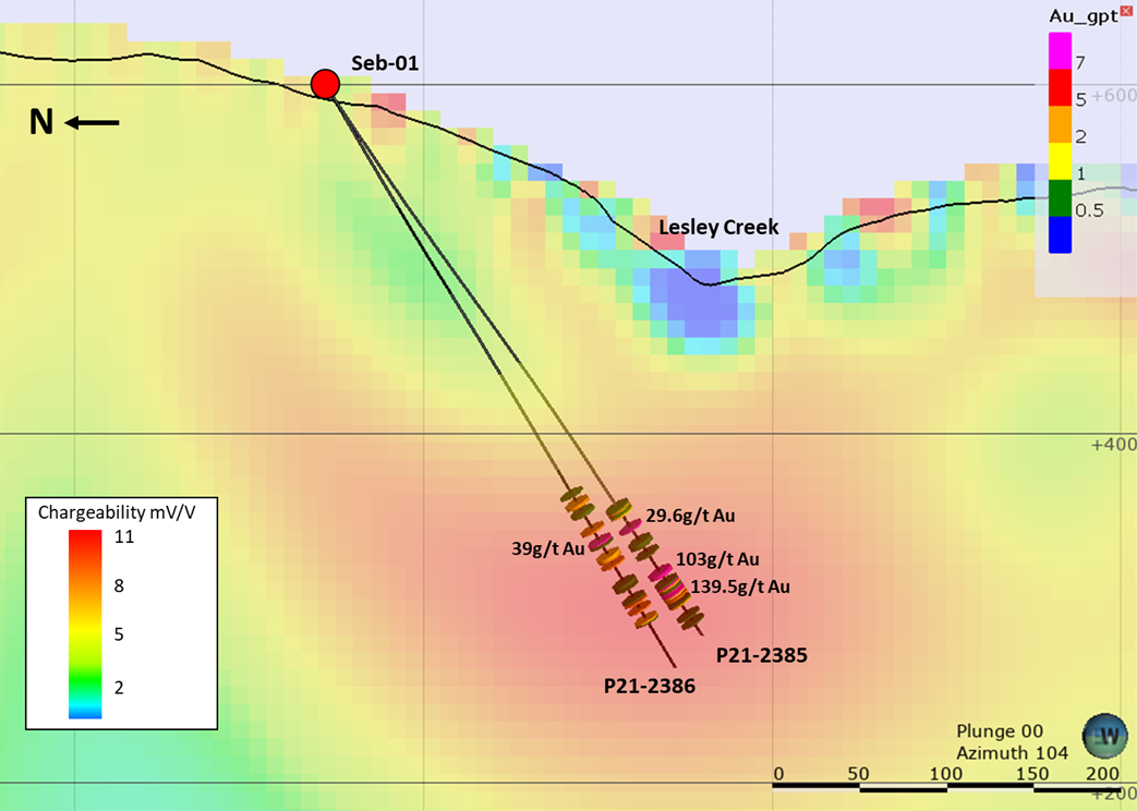 Figure 2 Cross section showing the new Sebakwe drill holes superimposed on an induced polarization section illustrating that the location of mineralization is coinciding with a chargeability feature in the geophysical data.