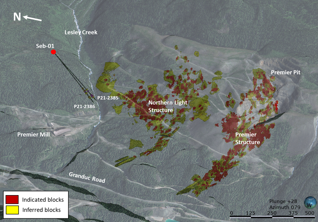 Two exploration drill holes (total of 820m) were completed in October 2021 targeting mineralization in the Sebakwe Zone to the north of established resources of the Premier deposit. Gold mineralization at Premier is hosted in two arcuate structures as depicted in Figure 1. The new drill holes targeted an area where historical drill holes from the 1920s and 1930s were completed, but did not have accurate location or survey information. These historical drill holes, and now the new holes, seem to indicate the possible existence of a third structure to the north of the two known structures.