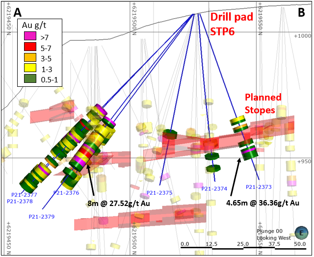- 27.52 g/t Au and 11.40 g/t Ag over 8.00m from a depth of 68.4m in hole P21-2379, including 66.70 g/t Au and 14.20 g/t Ag over 2.00m