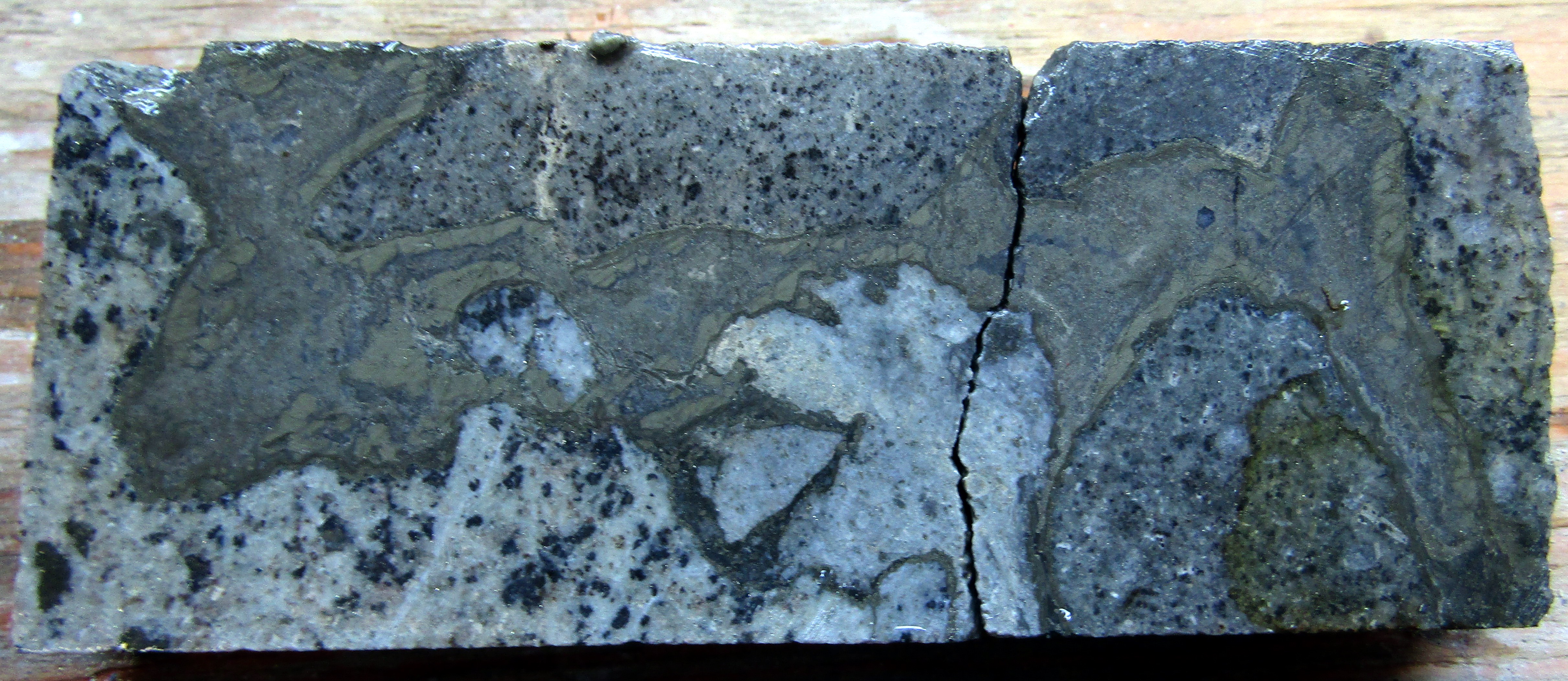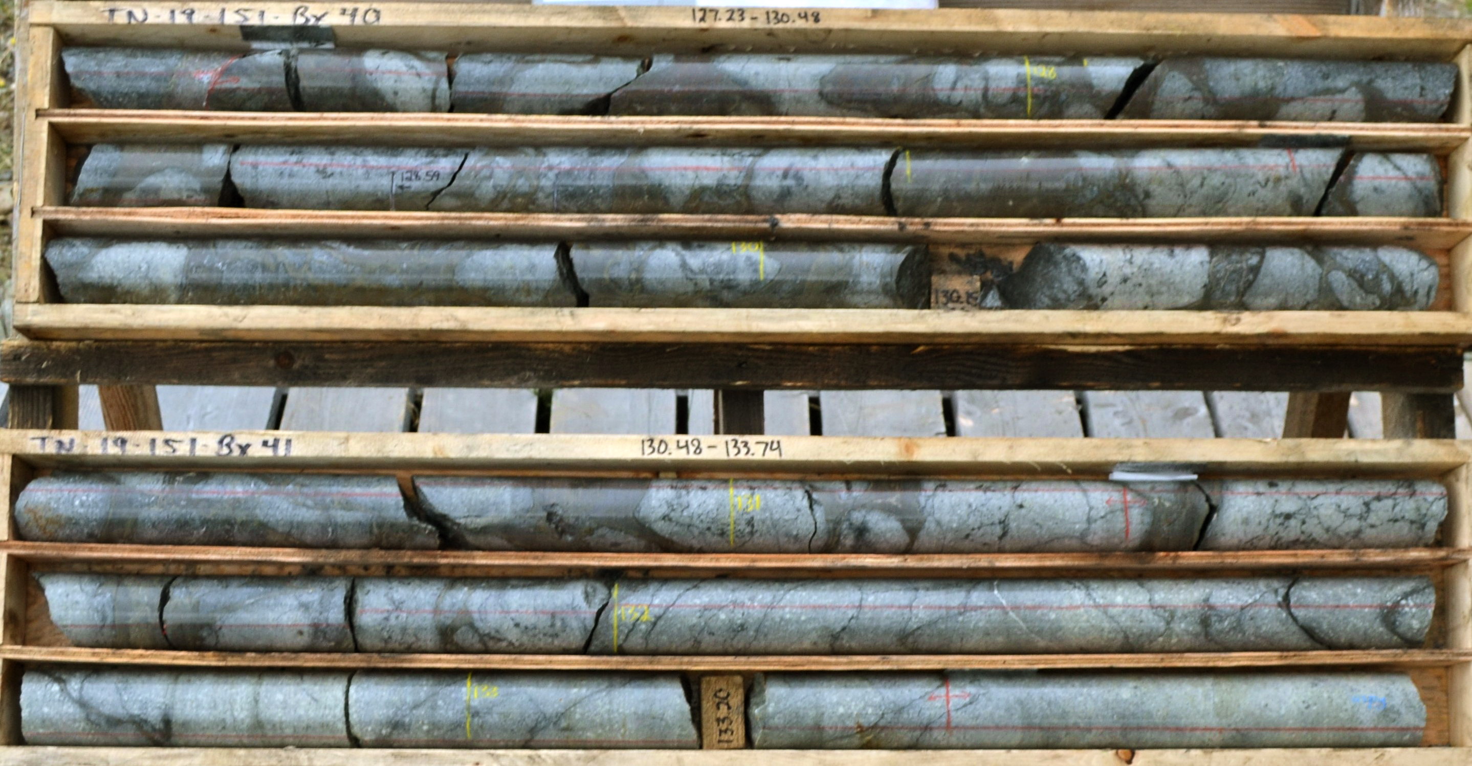 The mineralization in drill holes THN19-151 and 153 occurs as phases of sulphides and sulphosalts cementing the breccia matrix. Mineralization also occurs as disseminations, veinlets and cement to crackle style breccia. The dominant minerals are pyrite, tetrahedrite, sulphosalts, sphalerite, galena and chalcopyrite. Within the breccia matrix, these infill minerals form layered rims around breccia fragments.