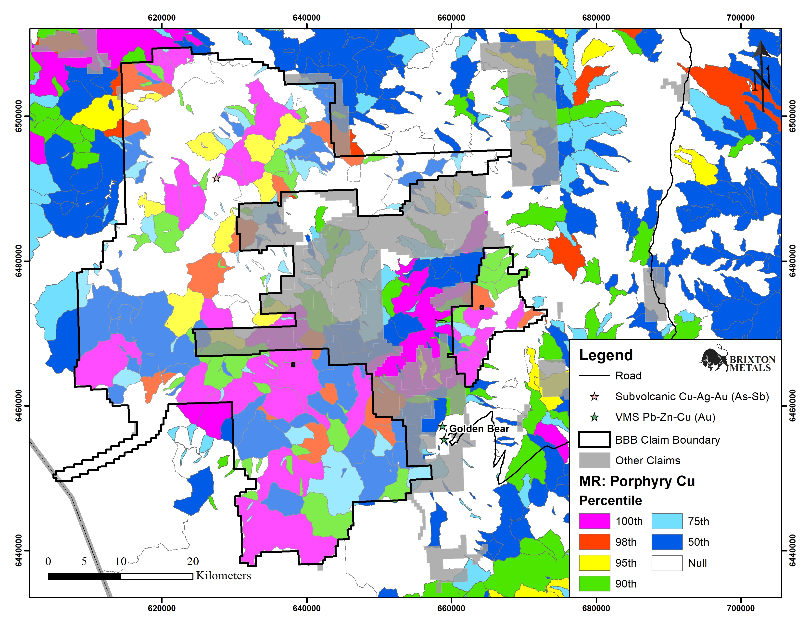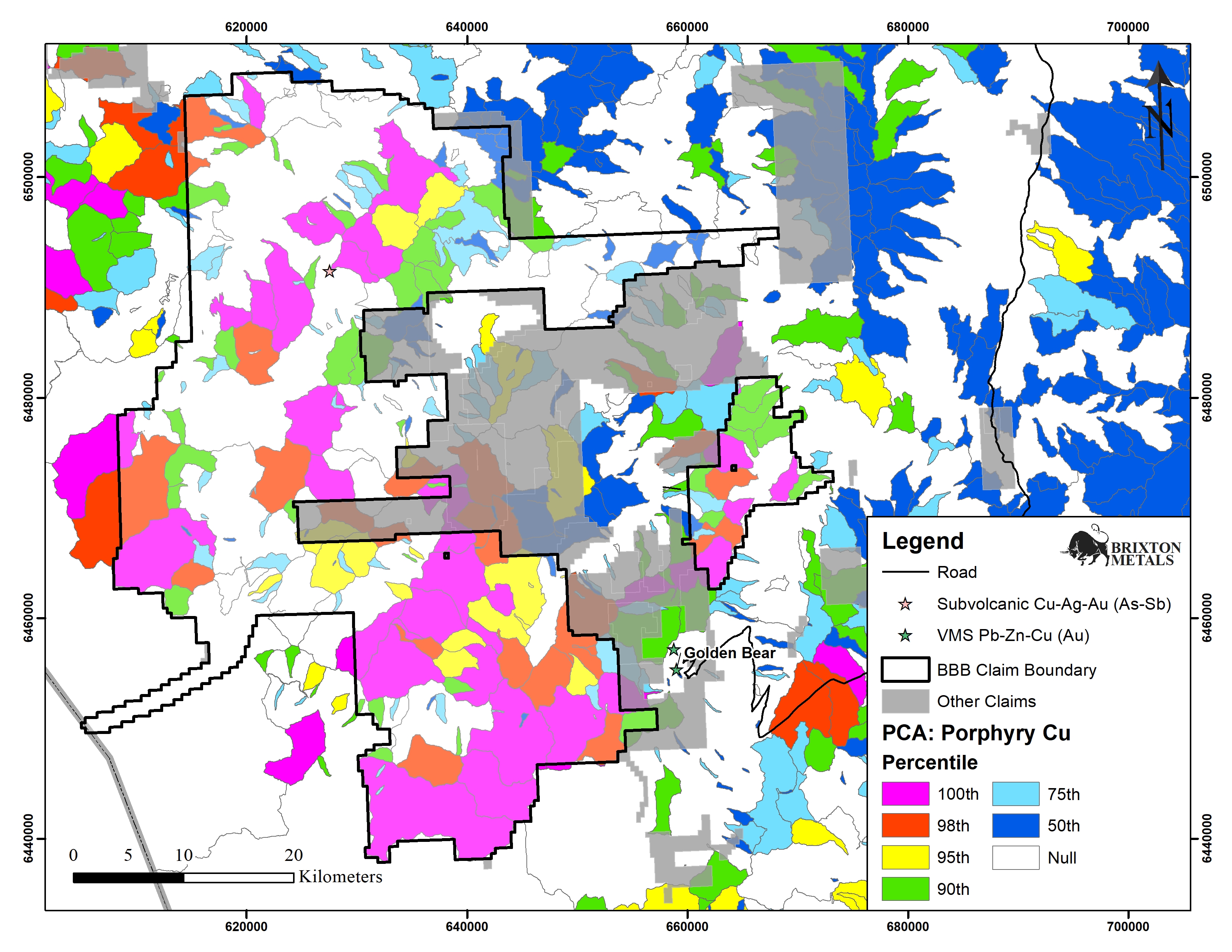 Brixton staked an additional 977 square kilometers of mineral claims in 2019. The new claims were based on the British Columbia Geological Survey re-analysis of stream sediment data. The data was from the Geoscience BC Report 2018-14, 18 May 2018: Porphyry Copper Weighted Sums using residuals following multiple regression analysis against principal components. Figures 6 and 7 show the high porphyry potential areas.