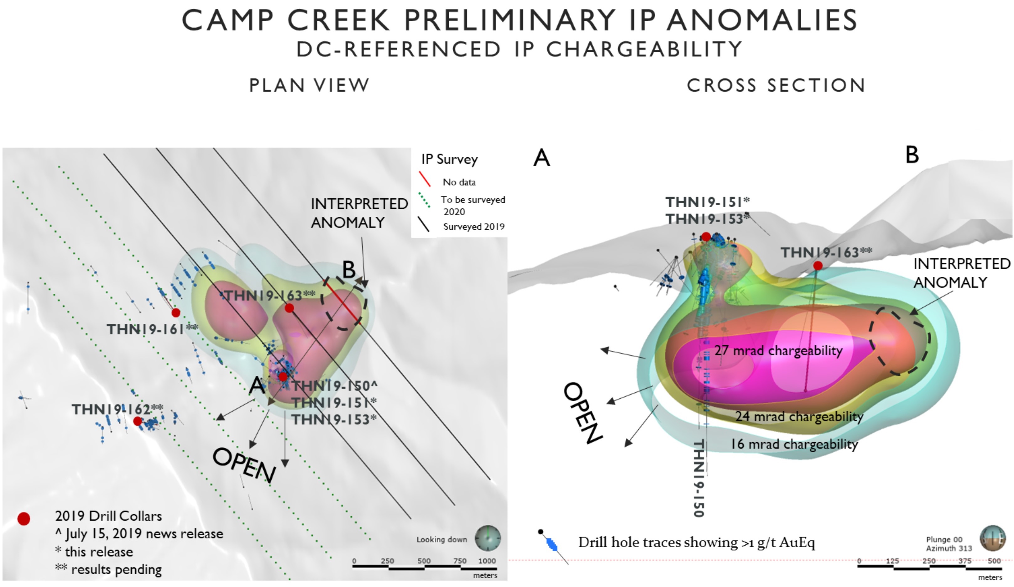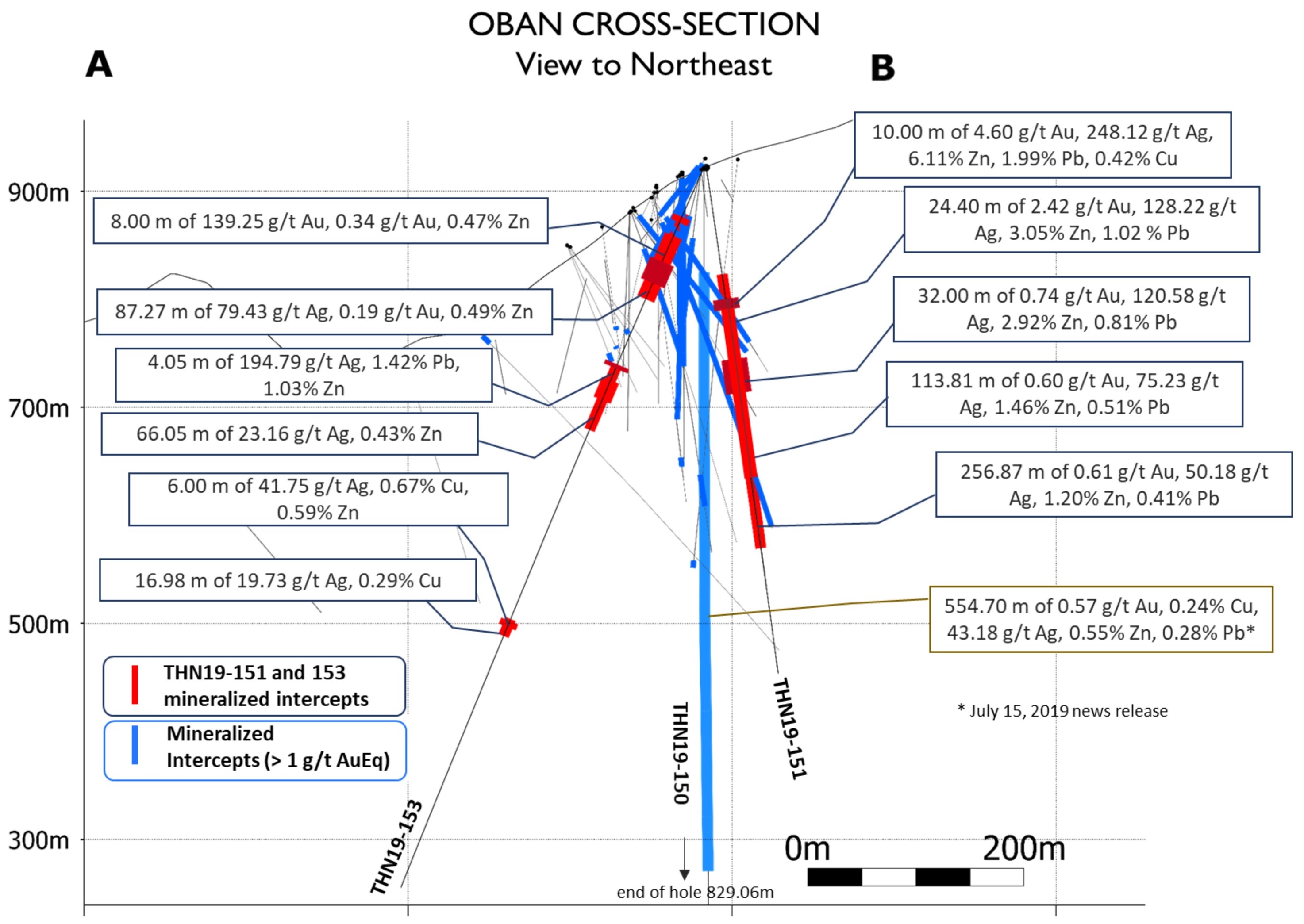 ° THN19-153 returned 87.27m of 0.19 g/t Au, 79.43 g/t Ag, 0.49% Zn, 0.26% Pb or 1.65 g/t AuEq over 87.27m.