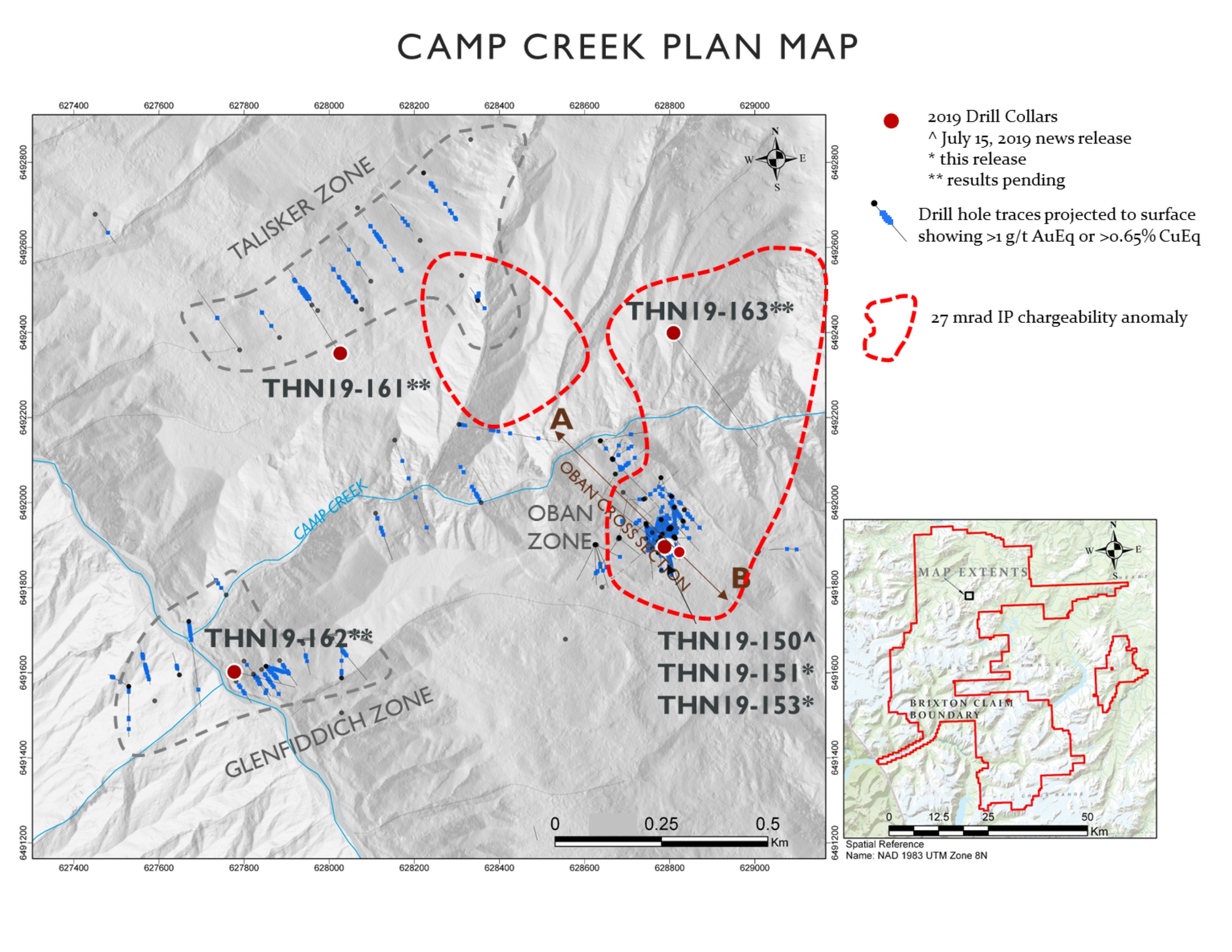VANCOUVER, British Columbia, Oct. 30, 2019 (GLOBE NEWSWIRE) -- Brixton Metals Corporation (TSXV: BBB) (OTCQB: BBBXF) (the “Company” or “Brixton”) is pleased to announce initial and preliminary results from its phase two exploration program at its wholly owned Thorn Project located in the Golden Triangle of British Columbia. Brixton completed 3 lines for a total of 9.1 line km of Titan24 DCIP-MT (induced polarization-magnetotelluric) geophysical survey across the Camp Creek Copper Corridor. The 2019 phase two drilling consisted of a total of 7,213m within 13 holes. The depths of the holes varied from 308m to 862m. Two core holes were drilled at the Outlaw sediment hosted gold-silver zone (assays pending), six core holes were drilled at the Chivas Porphyry target, four holes were drilled at the Camp Creek Copper Corridor target (Oban diatreme breccia pipe and Glenfiddich Zone - two holes have assays pending and holes 151 and 153 are released herewith) and one hole at the Talisker Zone. The combined phase one and phase two drilling at the Thorn Project for 2019 is 8,042m.