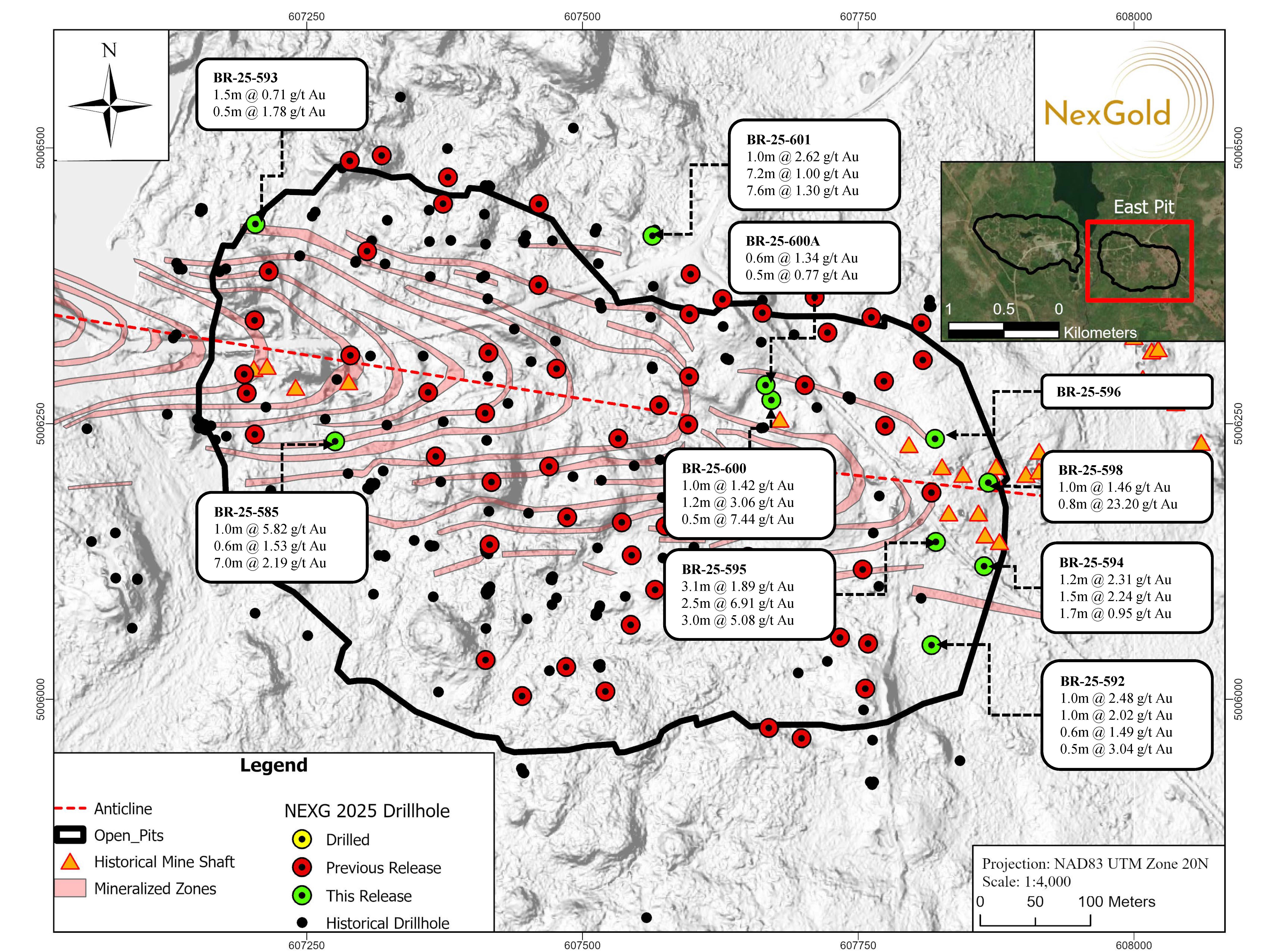 TORONTO, Aug. 20, 2025 (GLOBE NEWSWIRE) -- NexGold Mining Corp. (TSXV: NEXG; OTCQX: NXGCF) (“NexGold” or the “Company”) is pleased to provide final drill results from a recently-completed 26,854-metre diamond drill program initially announced on January 22, 2025 at the Company’s Goldboro Open Pit Gold Project (“Goldboro”) in Nova Scotia. The drill program was primarily designed to infill specific areas of the open pit Mineral Resource identified to improve geological and grade continuity and potentially upgrade certain areas of Inferred and Indicated Mineral Resources. The assay results for the final 14 infill diamond drill holes (BR-25-585 and 593 to 603), totalling 2,072.0 metres, were from drilling in the proposed west and east pits of the Goldboro Open Pit Gold Project (Figures 1 and 2; Tables 1 and 2).