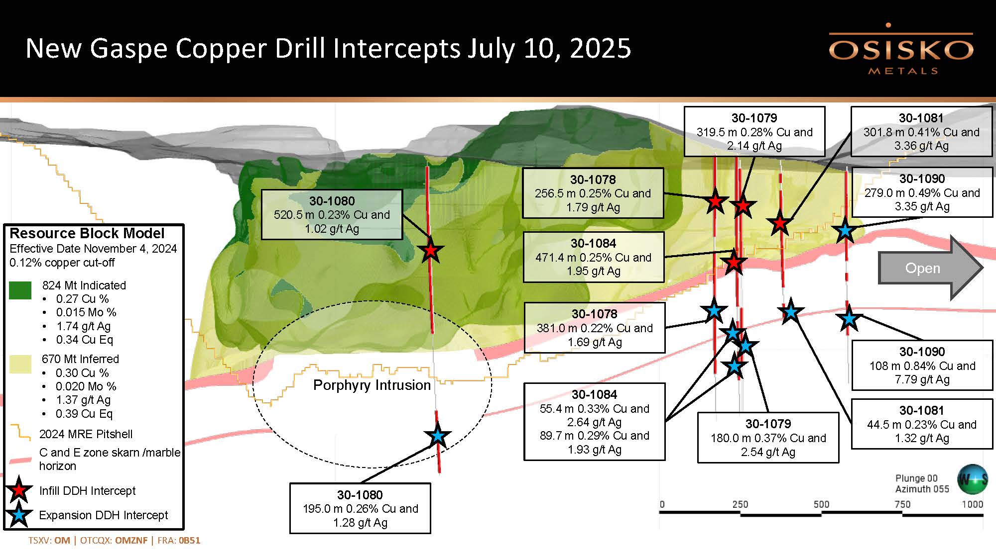 Drill hole 30-1080 (located at the northwest end of the deposit) intersected 520.5 metres averaging 0.23% Cu and 1.02 g/t Ag, followed by a second intercept of 195.0 metres averaging 0.26% Cu and 1.28 g/t Ag, extending mineralization 418 metres below the base of the 2024 MRE model to a vertical depth of 969 metres.